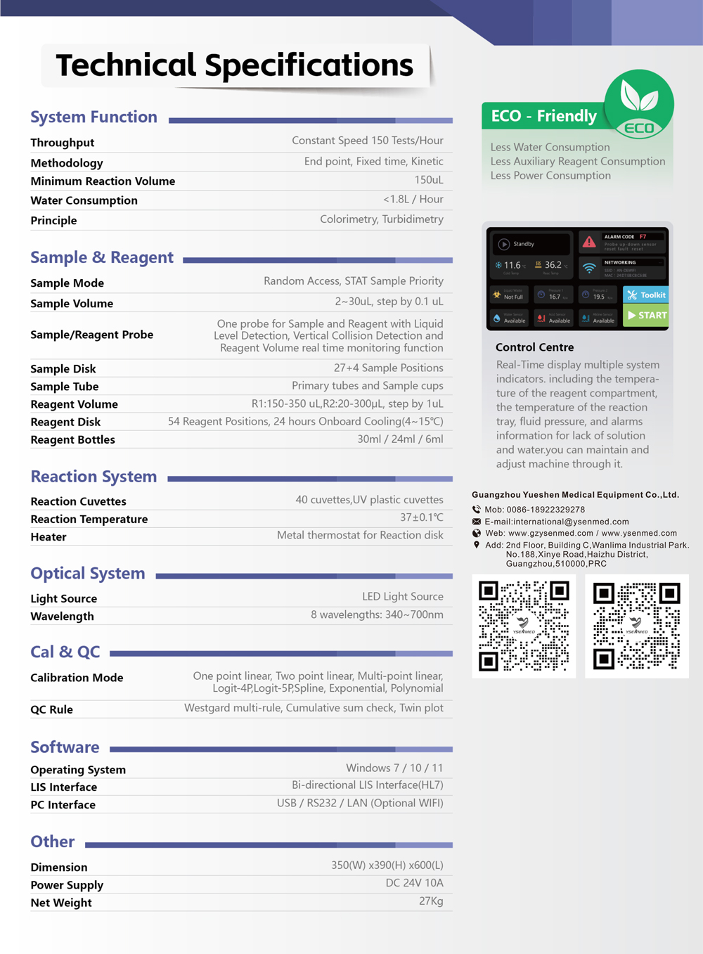 Analizador bioquímico totalmente automático YSTE-S150, con capacidad para 150 pruebas por hora.