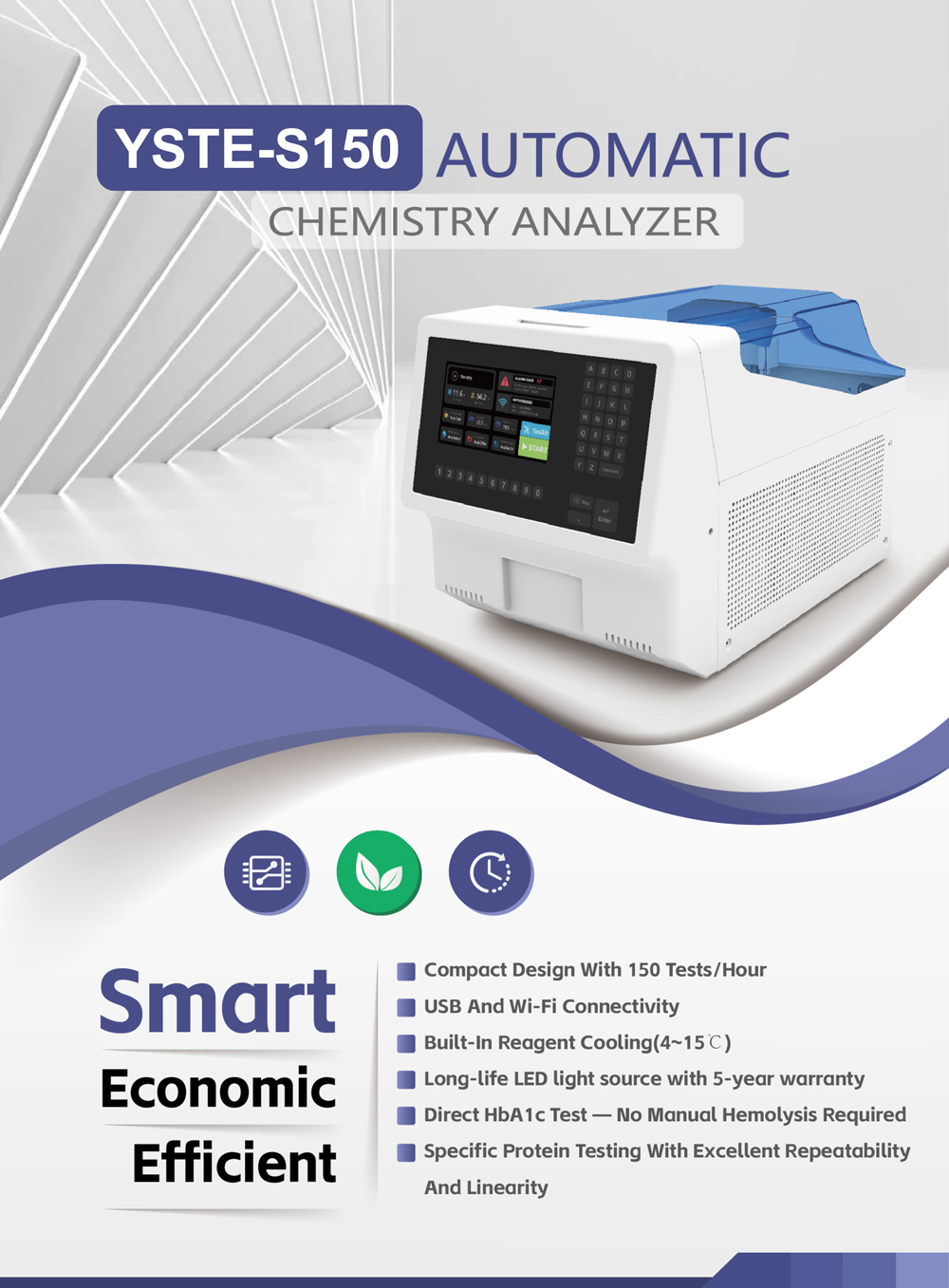 Analizador químico automático YSTE-S150: 150 pruebas/hora, prueba directa de HbA1c, fuente de luz LED y refrigeración de reactivos integrada.