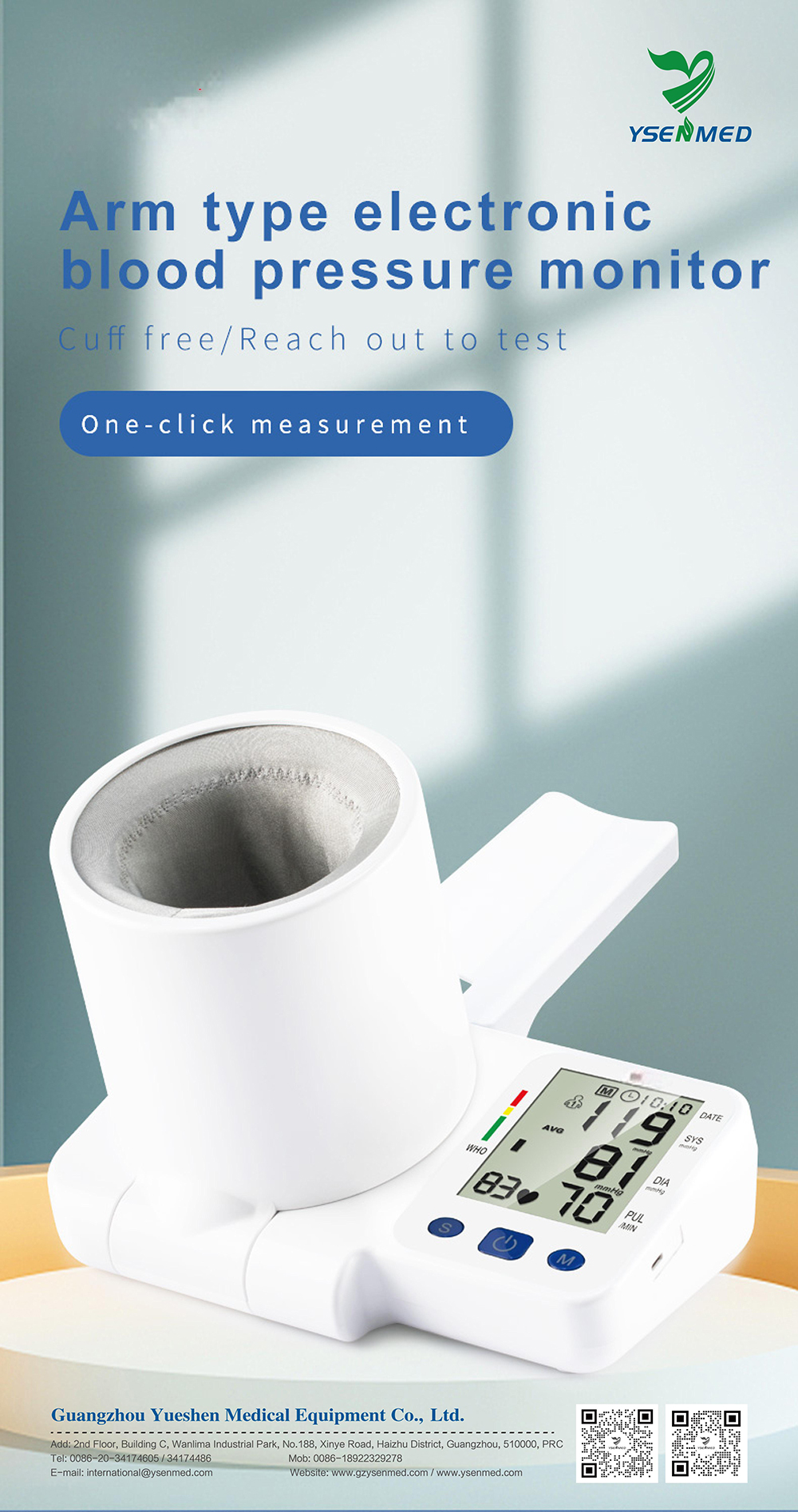 Monitor electrónico de presión arterial de brazo YSBPM-B886: Medición sin manguito con un solo clic y algoritmo DFFA para un diagnóstico clínico preciso.