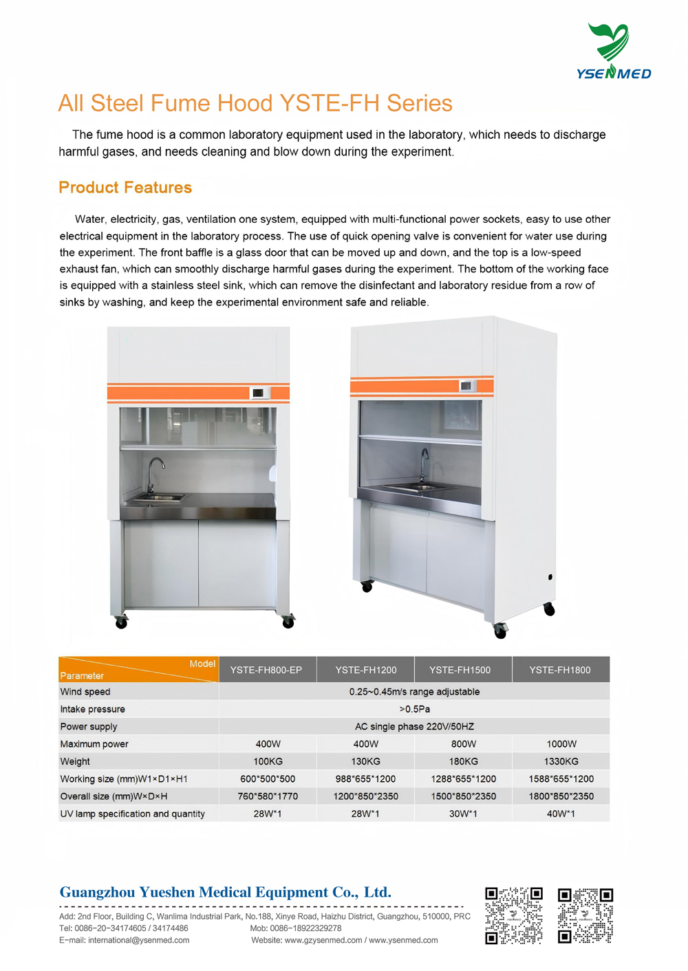 Campana extractora de acero de alta eficiencia YSTE-FH800-EP. Extracción de aire superior y cristal de seguridad ajustable para laboratorios. Protección confiable.