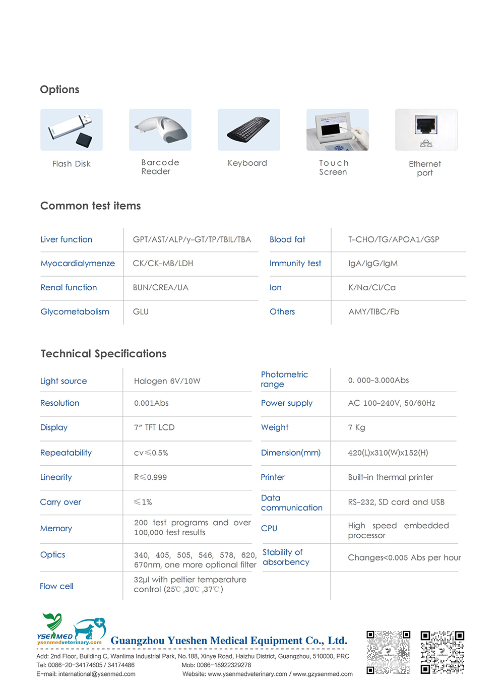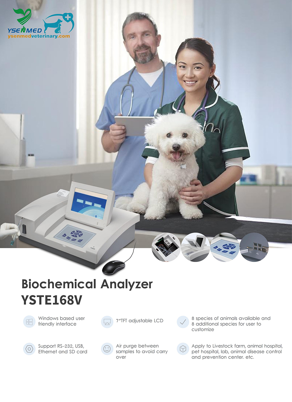 Analizador de bioquímica veterinaria semiautomático YSTE168V | Pantalla táctil precisa con Windows CE, 8 especies personalizables, impresora integrada y control de calidad multimétodo: ideal para clínicas e investigación